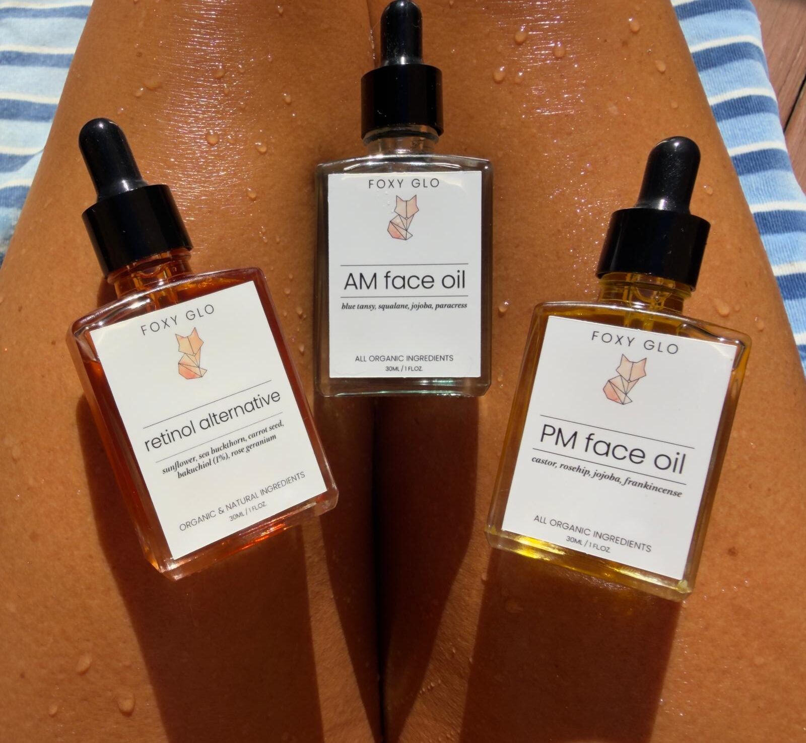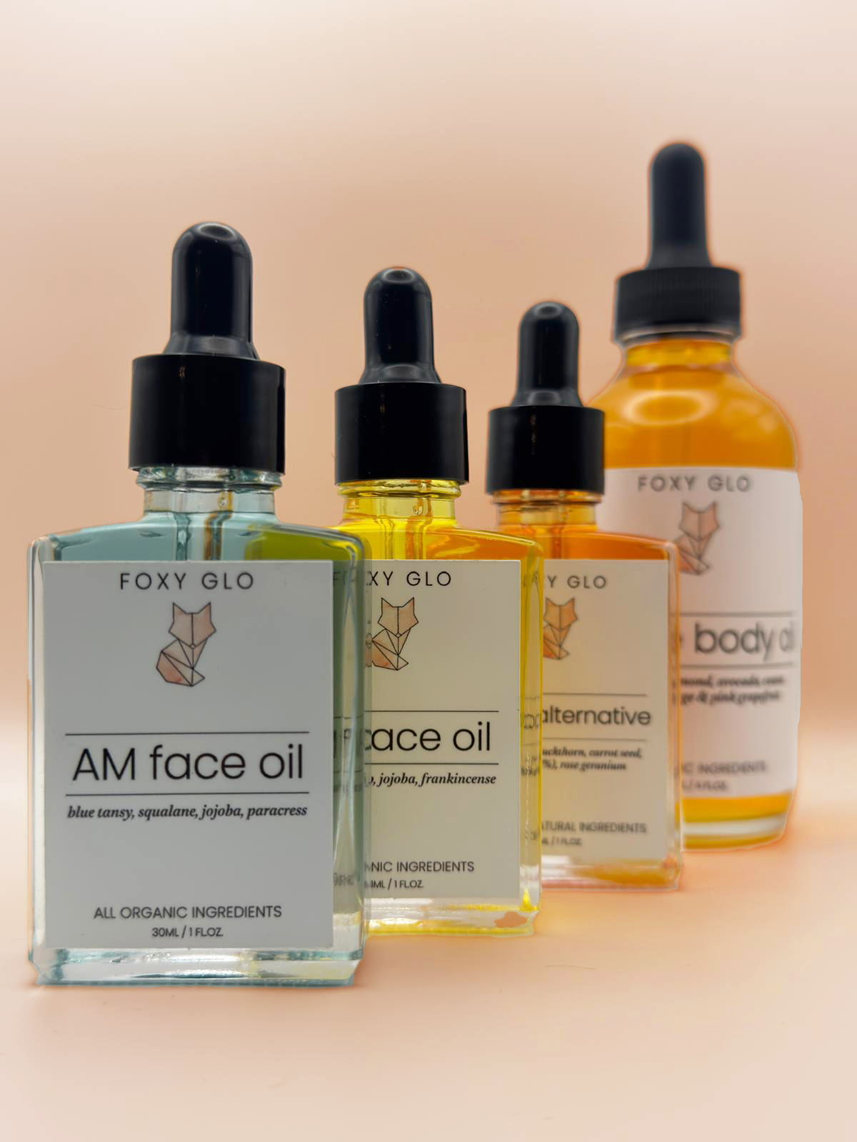 Your entire radiant skincare routine in one beautiful bundle. AM Face Oil for daytime glow, PM Face Oil for overnight renewal, Sunrise Body Oil for all-day hydration, and our Retinol Alternative for that extra boost—everything you need, nothing you don’t.